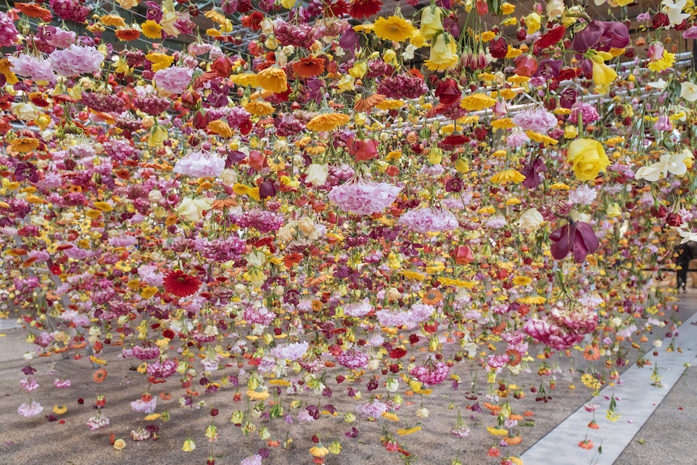 Le 30.000 corolle di ortensie, margherite, gerbere, peonie e altri fiori di stagione si sviluppano in verticale dal soffitto, riproducendo una vera e propria cascata di colori e profumi intensi. I fiori appesi tramite fili di rame, verranno lasciati essiccare naturalmente per raccontare in maniera suggestiva l’effimero decorso della vita.